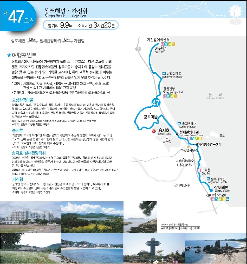 삼포해변에서 시작하여 가진항까지 둘러 보는 47코스는 다른 코스에 비해 짧은 거리이지만 19세기를 전후하여 건립된 북방식전통한옥 21동이 전국적으로 유일하게 밀집되어 있는 전통민속마을인 왕곡마을과 겨울철새 고니의 도래지이며 수심이 일정해 도미와 전어, 그리고 민물고기인 잉어가 함께 살고 있는 송지호, 그리고 풍광과 철새들을 관찰 할 수 있는 철새 관망 탸워가 있어 볼거리가 가득한 코스이다. 또한 공현진해변의 일출은 잊지 못할 추억이 될 것이다.