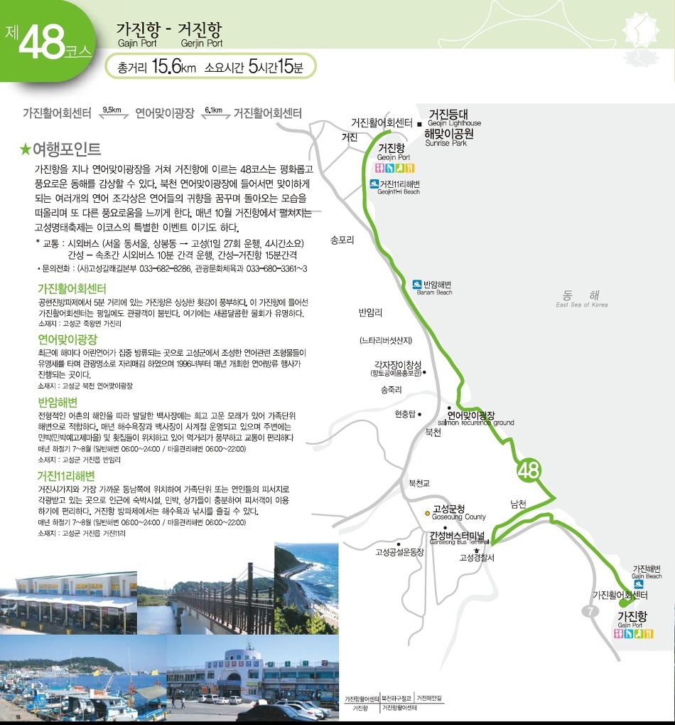 가진 활어센타가 유명한 가진항을지나 해마다 어린 연어가 집중 방류되고 고성군에서 조성한 연어관련 조형물들 유명세를 타고 있어 관광명소로 자리매김하고 있는 연어맞이광장을 거쳐 거진항에 이르는 48코스는 평화롭고 풍요로운 동해를 감상할 수 있다. 매년 10월 거진항에서 펼쳐지는 고성명태축제는 이코스의 특별함 이기도 하다.