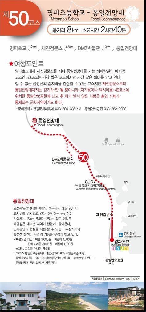 동해안 최북단의 해발 70m 고지에 위치하고 있으며 가깝게는 16km, 멀리는 25km 정도로 금강산이 가깝다는 통일전망대.명파초교에서 제진검문소를 지나 통일전망대를 가는 해파랑길의 마지막 코스인 50코스는 가장 짧은 코스이지만 가장 많은 의미를 담고 있다. 민족분단의 현실을 직접 볼 수있는 갈 수 없는 금강산의 끝자락을 감상할 수 있는 코스지만 제진검문소부터 통일 전망대까지는 걷기가 안 될 뿐아니라 (자가용이나 택사이용) 49코스에 위치한 통일안보공원에 신ㅅ고 후 허가 받지 않은 사람은 출입 자체가 통제되는 군사지역이기도 하다.