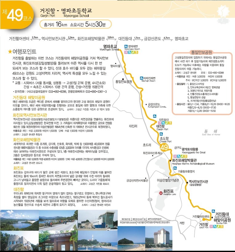 거진항을 출발하는 이번 코스는 매년 새해 해맞이 행사를 진행하는 곳으로 통일에 대한 염원과 가족에 대한 소중한 의미를 담은 거진등대의 해맞이공원을 거쳐 역사안보전시관(김일성별장, 이승만 별장, 이기붕별장), 세계적으로 희귀한 각종 조개류, 갑각류, 산호류, 화석류, 박제등 1500여종 4만여점등을 전시한 화진포해양박물관등 둘러보면 아픈 역사를 다시 한번 되새겨 보는 코스라 할 수 있다. 산과 호수 바다를 모두 걷는 해파랑길 49코스는 가원도 고성지역의 지리적, 역사적 특성을 모두 느낄 수 있는 코스라 할 수 있다.