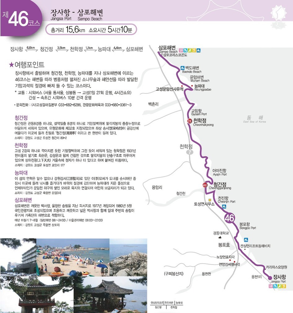 장사항에서 출발하여 관동팔경의 하나이면서 설악일출 8경을 자랑하며 유형문화재 제 32호로 지정된 청간정이 있으며, 고성 2경 중의 하나로 기암절벽위에 그림처럼 서있는 천학정과 운암천 하구에 모여된 모래로 유지와 연결이 되어 어민들의 보금자리가 되어있는 능파대를 지나 깨끗한 백사장과 울창한 송림으로 국민관광지로 조성된 삼포해변에 이르는 46코스는 해변을 따라 병풍처럼 펼쳐진 소나무숲과 해안선을 따라 발달한 기암괴석의 절경에 빠져 들 수 있는 코스이다.