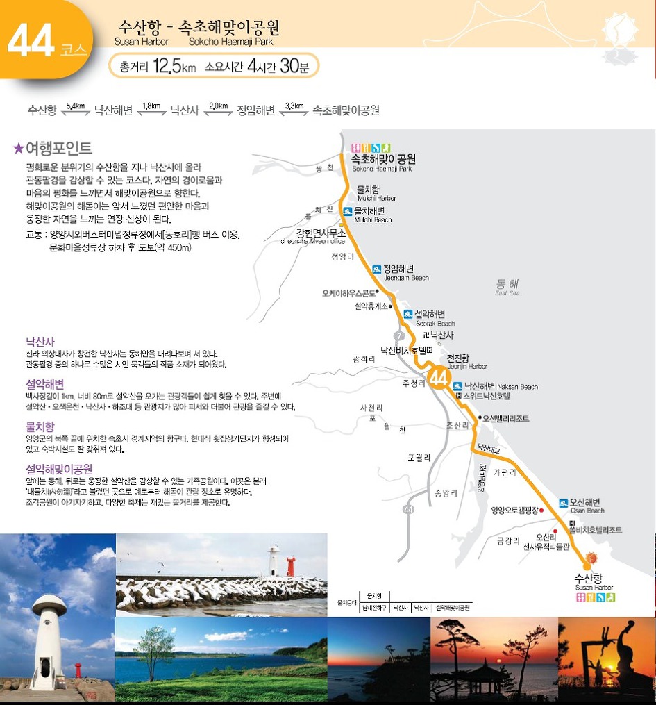 수산항(5.4km) - 낙산해변(1.8km) - 낙산사(2.0km) - 정암해변(3.3km) - 속초해맞이공원