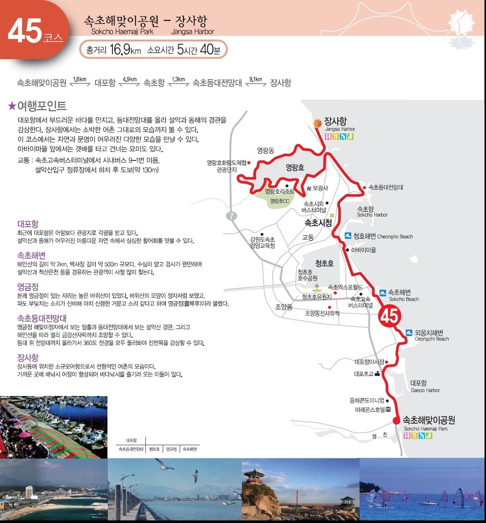 속초해맞이공원(1.6km) - 대포항(4.9km) - 속초항(1.3km) - 속초등대전망대(9.1km) - 장사항