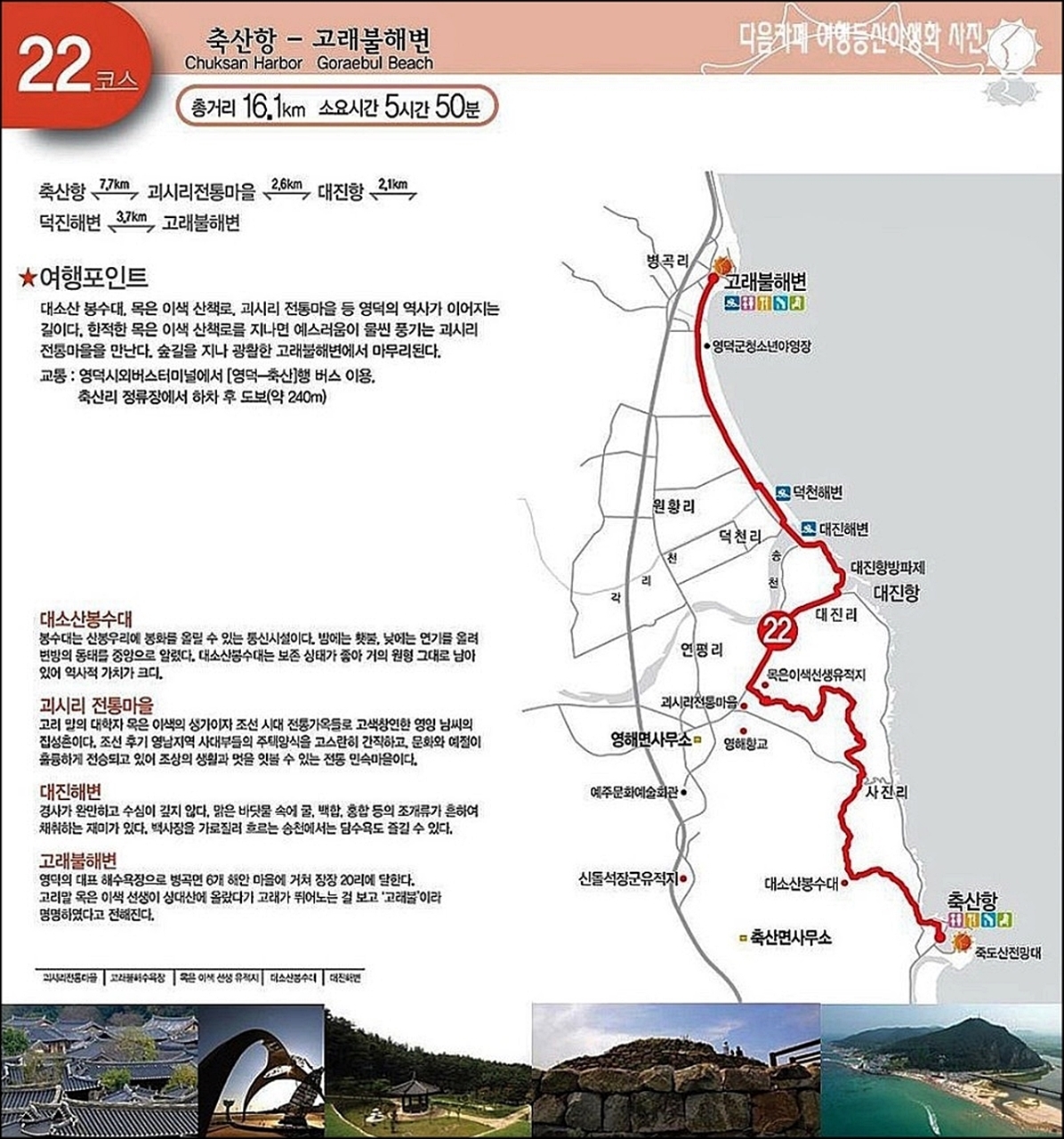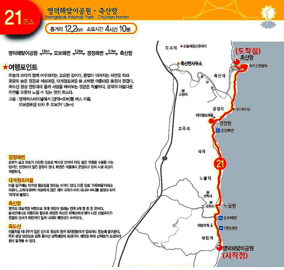 축산항(7.7km) - 괴시리전통마을(2.6km) - 대진항(2.1km) - 덕진해변(3.7km) - 고래불해변