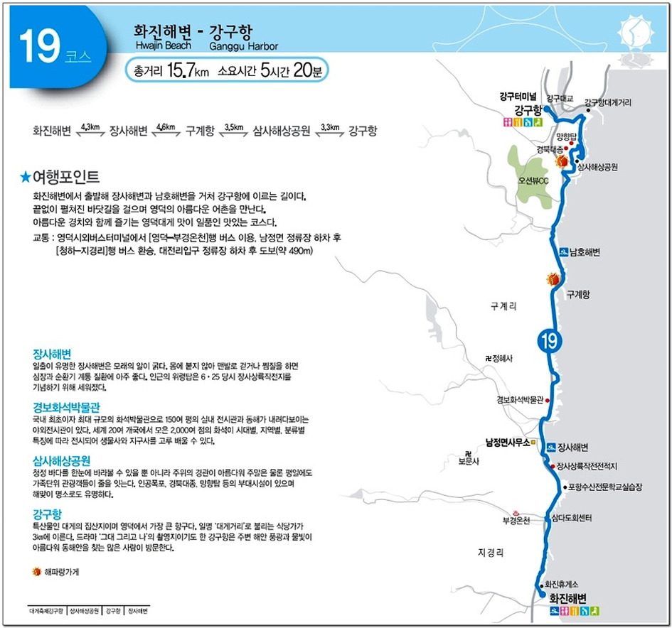 화진해변(4.3km) - 장사해수욕장(4.6km) - 구계항(3.5km) - 삼사해상공원(3.3km) - 강구항